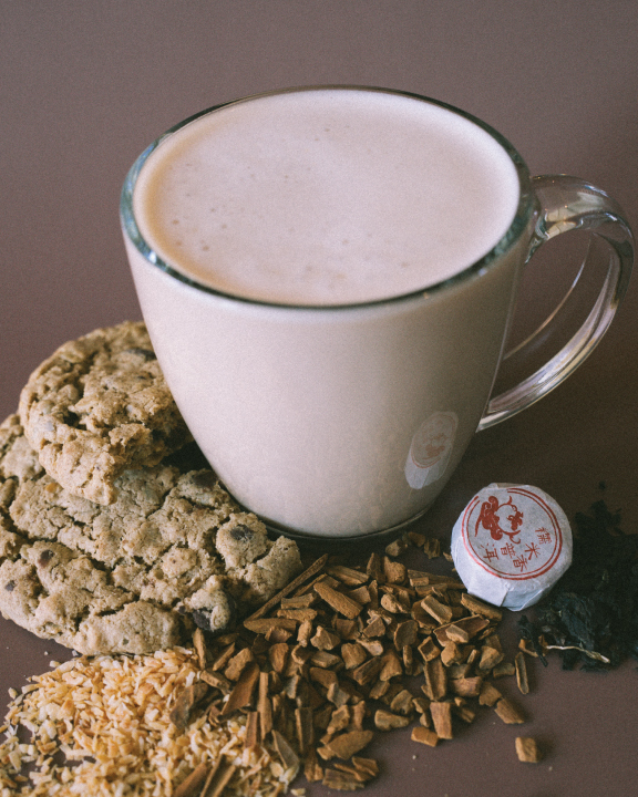 Crazy how much it tastes like an oatmeal cookie! Using our sticky rice pu-erh steeped with cinnamon chips and roasted coconut, with a touch of honey for sweetener. Best with oat milk, but can be made with any choice of milk.