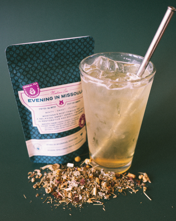 A fizzy fall twist on a Montana classic. We turn the beloved Evening in Missoula herbal tea into a rich, house-made syrup with organic cane sugar, then blend it into sparkling water for a crisp, refreshing drink that’s subtly sweet and beautifully botanical.